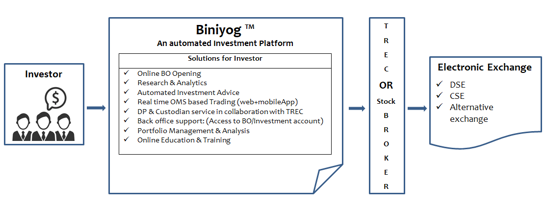 Biniyog™ is a digital investment platform; with an integrated Investment research, virtual investment advisor, and real time trade order management system (OMS). The platform facilitates investments in Bangladesh capital market through direct market access via registered TREC holders. Biniyog ™ is jointly operated by Frontier Fin-Tech BD Ltd and TREC holder(s).